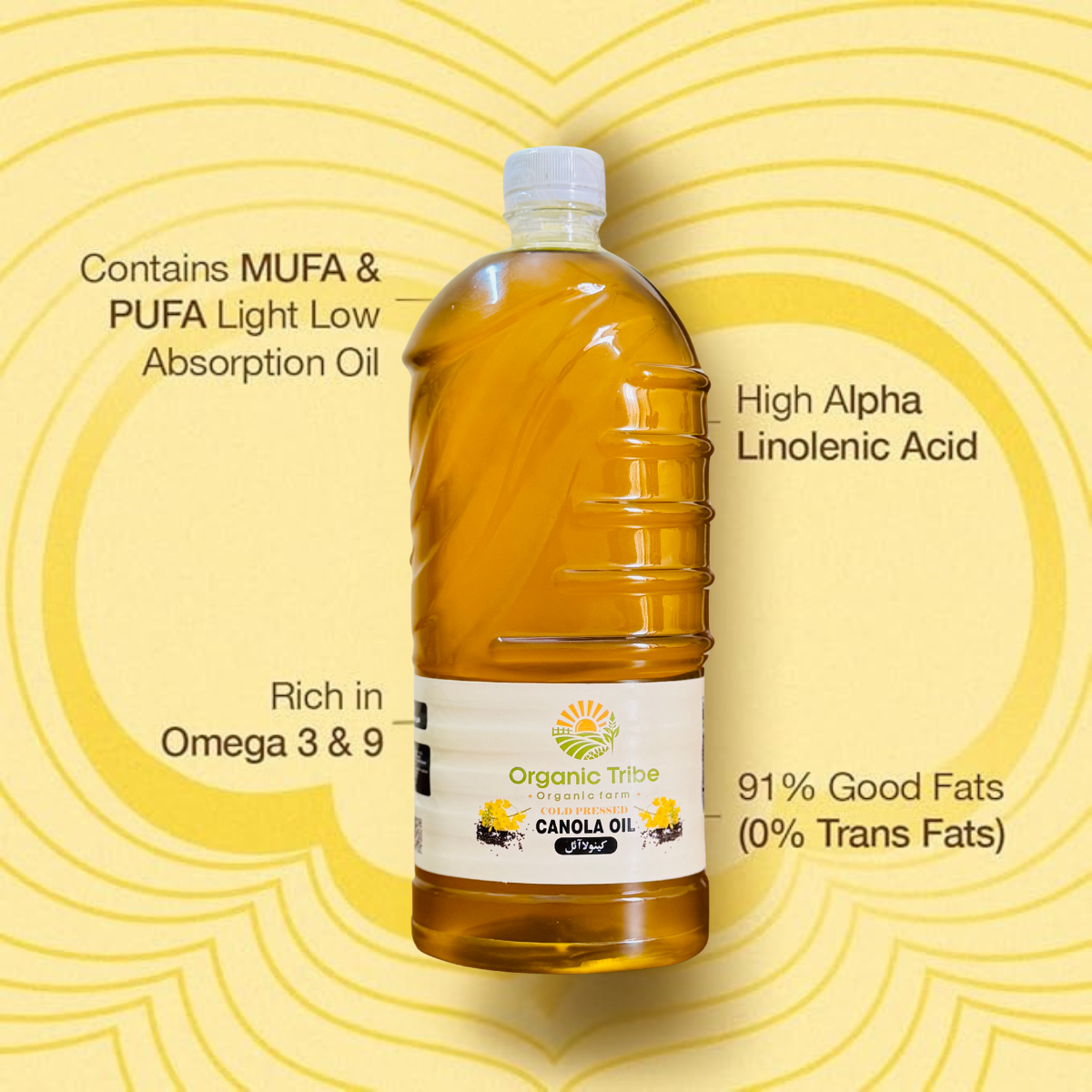 Organic Tribe’s Pure Canola Oil – Light, heart-healthy, and rich in Omega-3. Perfect for cooking, frying, and dressing, it brings a smooth taste and nutritional goodness to every meal!